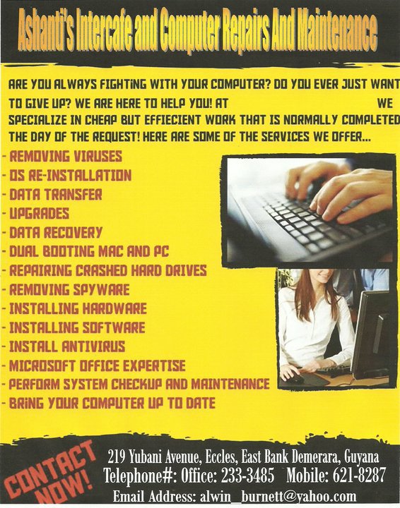 In today’s customer service oirented society, timely, friendly, proactive service is sought to enhance future business growth. At Ashanti’s Internet Cafe’ and Computer Repairs we strive for excellence and fast service when assisting our most valuable customers clients. We set our prices with you our customers in mind so be sure to visit us today.